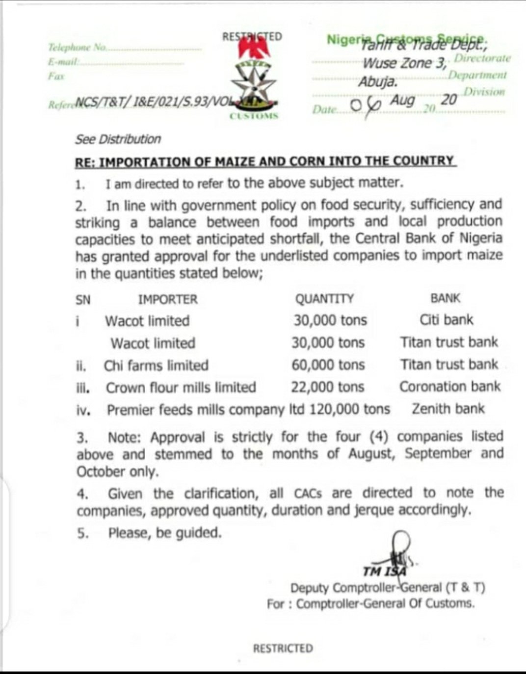The Nigeria Customs Service warned that only the above 4 companies are allowed to import maize into the country and the exercise would run strictly from August to October.