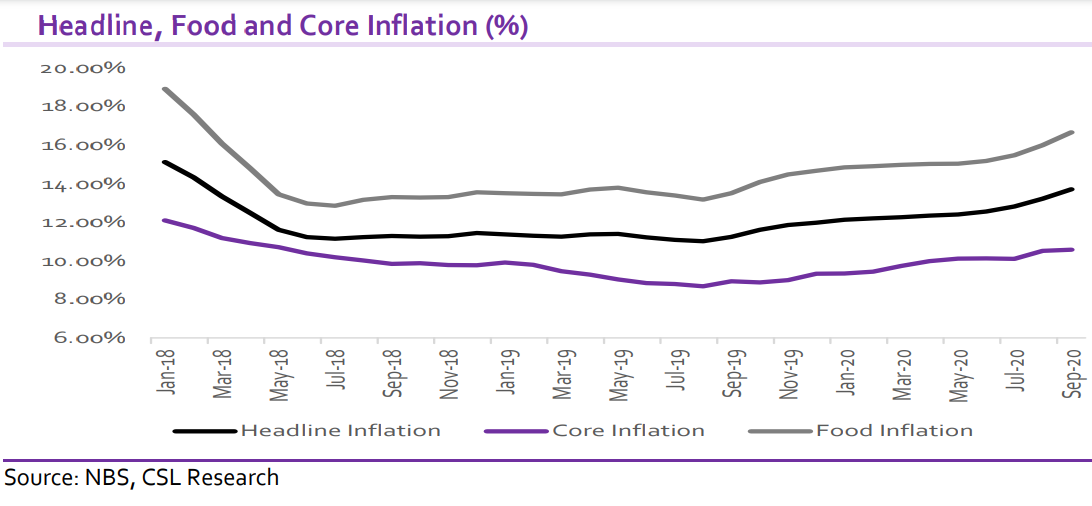 In September 2020, the food sub-index was up 16.66% (0.66ppt higher than September’s 16.00%) while it rose by 1.88% on a m/m basis (0.21ppt higher than August’s 1.67%). In our last inflation note, we highlighted how abnormal rainfall patterns, reduced farming activities in the lockdown months and sustained farmers/herdsmen clashes have hampered farm output since the beginning of the harvest season. We believe, the poor harvests which