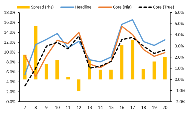 * core (Nig) refers to the present definition of core inflation, Core (True) is the theoretical definition of core inflation. Spread is the difference between headline and True core inflation.