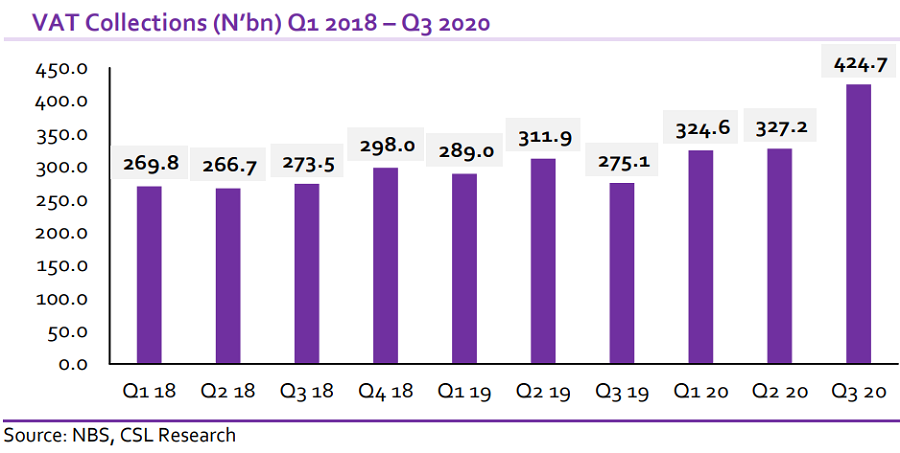 Earlier this week, the Nigerian Bureau of Statistics (NBS) published data on Value Added Tax (VAT) collection for the first nine months of 2020. According to the data, VAT collection increased by a decent 22.9% y/y to N1.1tn in 9M 2020 from N876.1bn in 9M 2019.