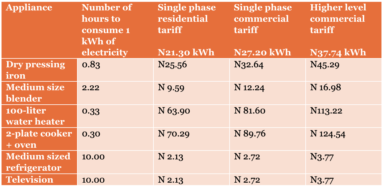 Depending on the product brand, this data from Ikeja Electric shows how the following specifications of some household appliances consume power on different tariff plans: