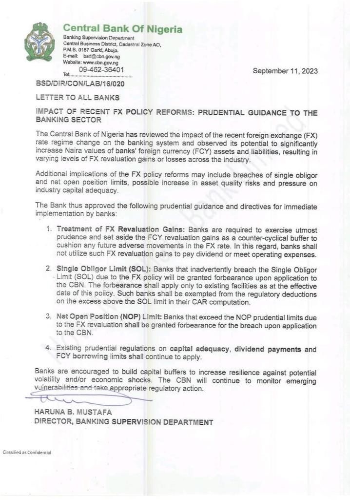 The CBN has taken into account that the recent FX policy changes could lead to regulatory breaches such as exceeding Single Obligor Limits (SOL) and Net Open Position (NOP) limits.