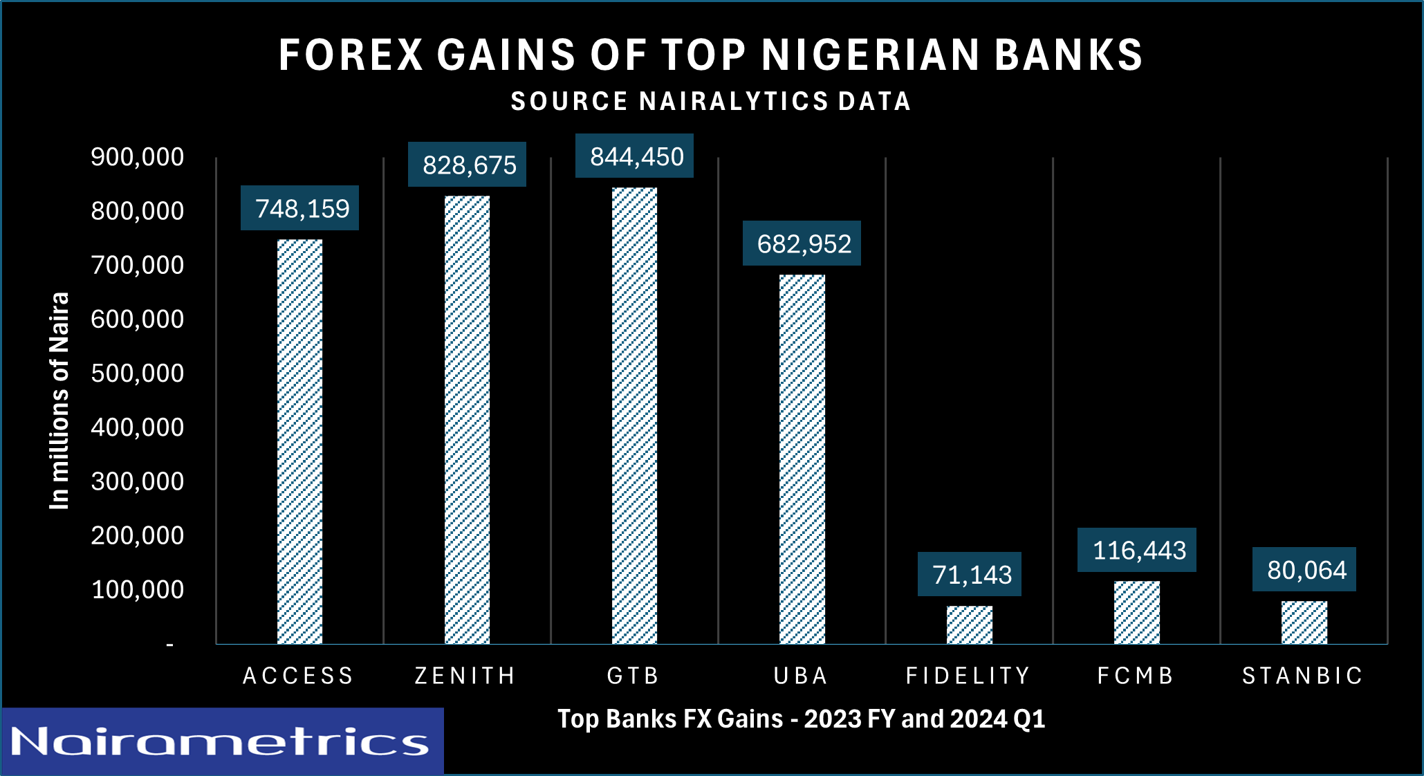 Top Nigerian Banks raked in a profit of N3.3 trillion in 2023 mostly arising from forex revaluation gains. This is according to data from Nairalytics. In 2023, the top 7 local banks raked in N2.48 trillion while in 2024 first quarter they raked in a whopping N882.9 billion.