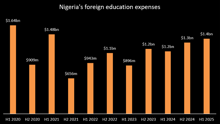 Nigerians spent a total of $1.39 billion (N2.16 trillion) on foreign education in the first half of 2025, marking a significant increase from the corresponding period in 2024.
