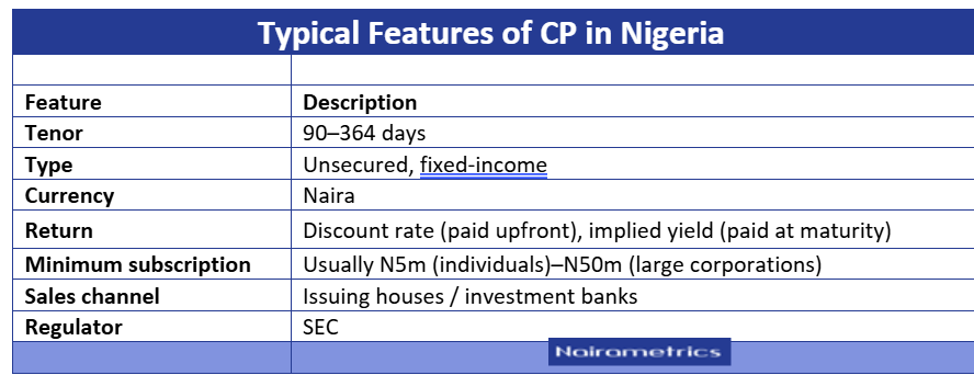 In Nigeria, CPs typically have tenors between 90 and 364 days and are categorized as money market instruments due to their short maturity.