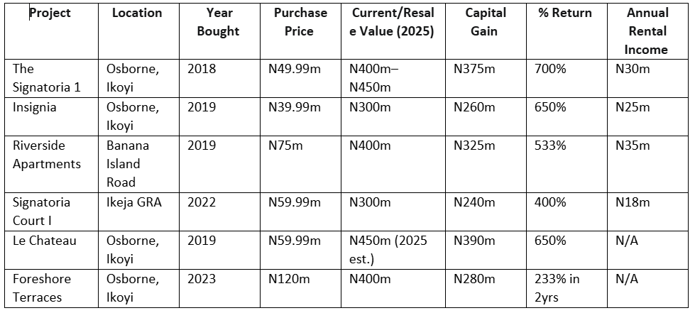 A subsidiary of the Lekki Gardens group, Foreshore Waters has quietly built a reputation for launching projects at what now look like laughably low entry prices in Ikoyi, and Banana Island and Ikeja, GRA, only for values to explode 400–700% within 3–5 years.