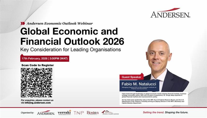 - Andersen Nigeria — a collaboration of five professional services firms — will host a high-level webinar titled“Global Economic and Financial Outlook 2026: Key Considerations for Leading Organisations,” featuring Fabio M. Natalucci, CEO of the Andersen Institute for Finance & Economics and former senior official at the IMF, U.S. Federal Reserve, and U.S. Treasury.