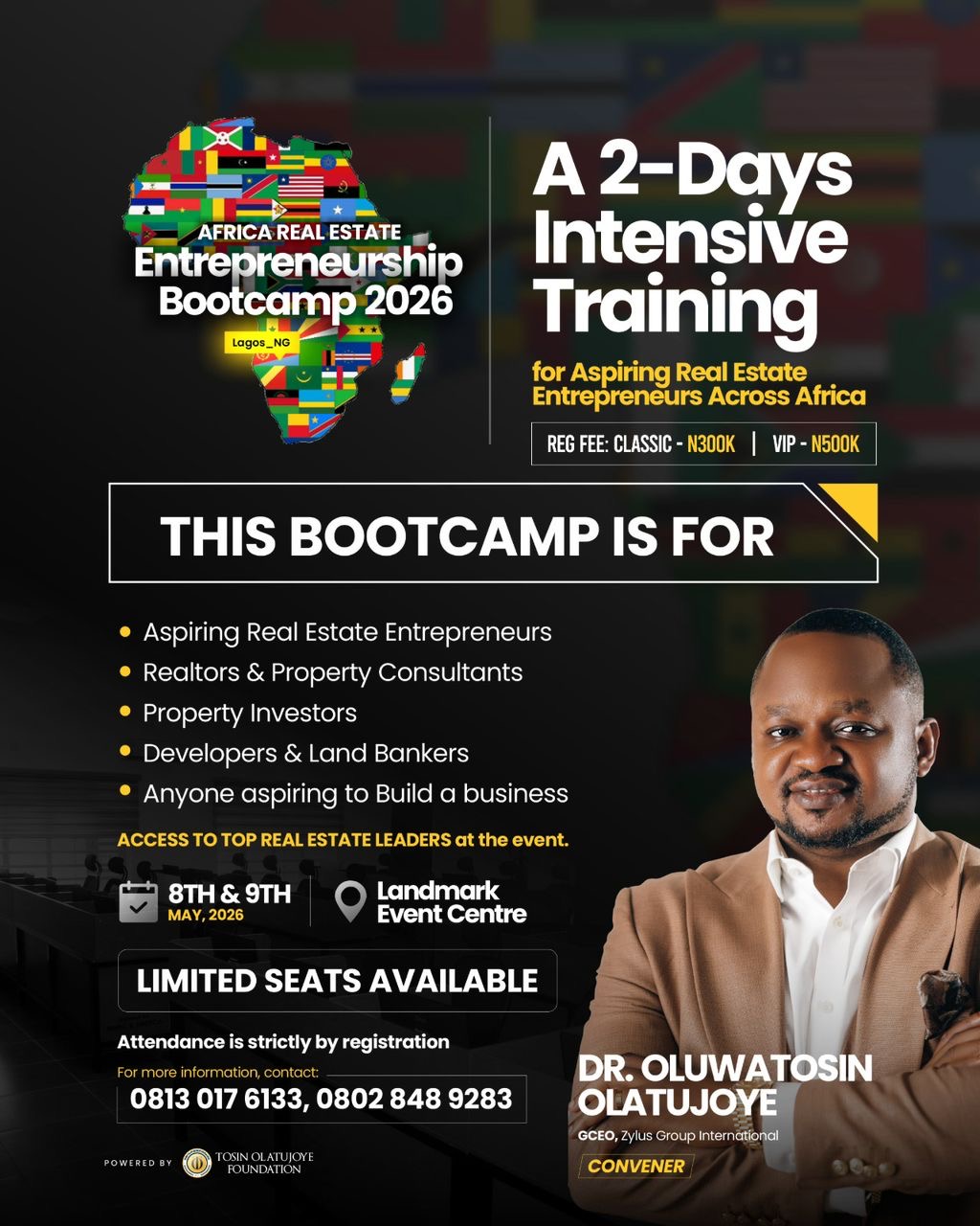 The bootcamp, powered by the Tosin Olatujoye Foundation, will bring together aspiring real estate entrepreneurs, investors, consultants, developers, and professionals from across Africa for an immersive learning experience focused on the art, science, and business of real estate entrepreneurship.