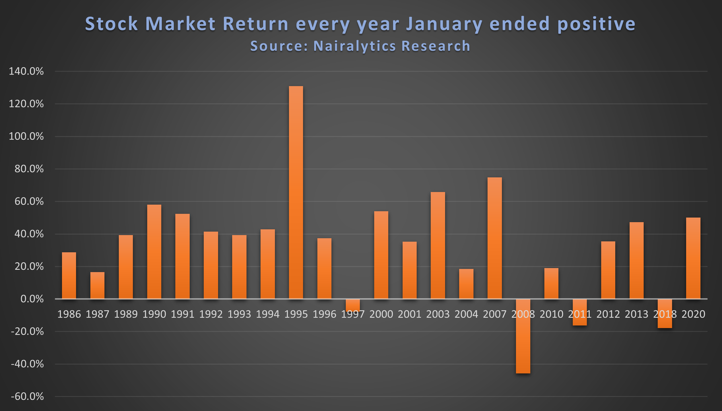 The Month of January is hardly a bellwether for what to expect throughout the year but if data is anything to rely on then stocks have ended the year on a positive note 19 times out of 24 whenever January ends with a positive return.