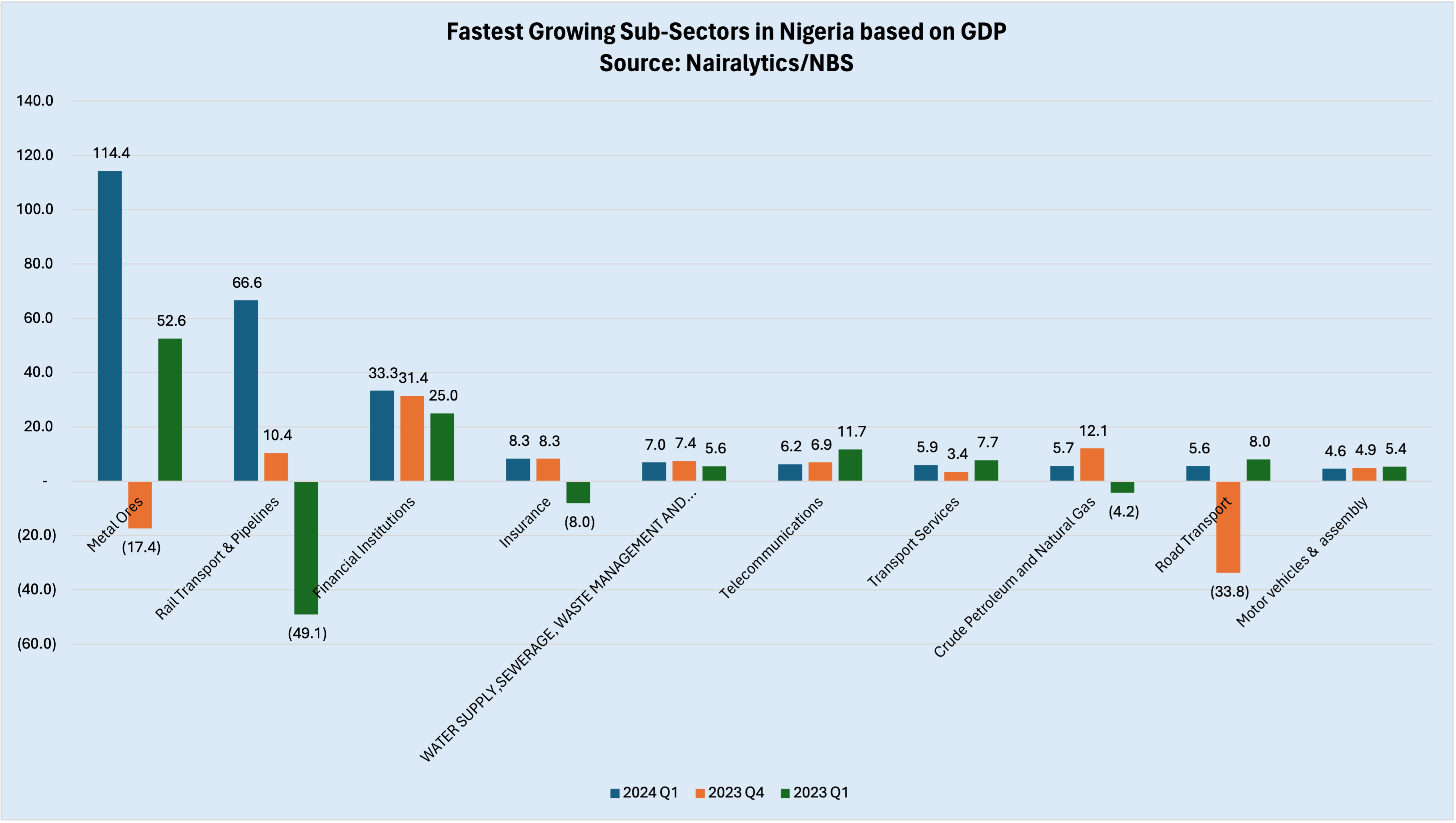 1. Meta Ores– Like the rail transport sector before it, the metal ores sector saw a rebound from a negative growth of –17.39% in the last three months of 2023 to +114.35% in Q1 of 2024. This positions it as the fastest-growing sector in the Nigerian economy in the first quarter of 2024.
