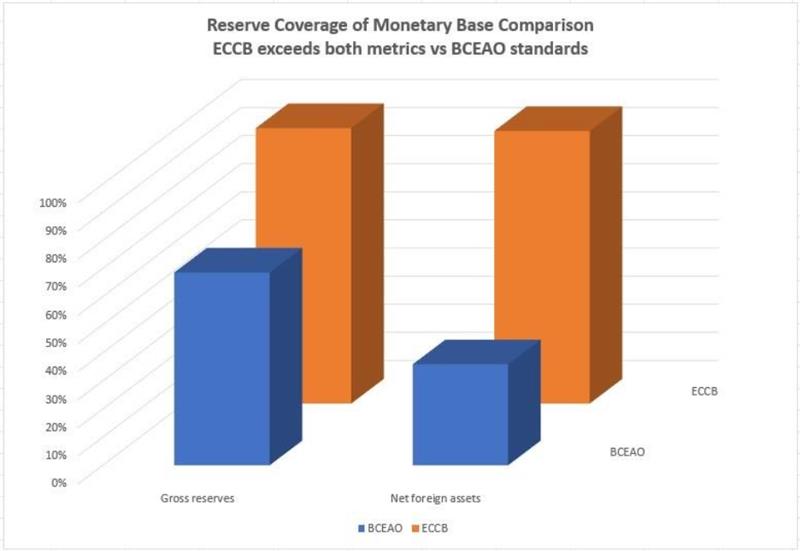 Recent IMF scenarios (Country Report 25/110, May 2025) show that under adverse financing or terms-of-trade shocks—such as oil export values dropping or gold and cocoa prices remaining at 2024 levels—WAEMU reserve coverage could fall below the minimum threshold, even after the current cyclical rebound. When net foreign assets are compared to the monetary base and benchmarked against the Eastern Caribbean Central Bank (ECCB), the region’s unencumbered reserves look much weaker than headline figures suggest.